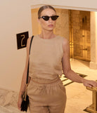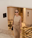 Důkaz, že i jednoduchý jednobarevný look dokáže být neskutečně šik a elegantní. Lněné oblečení se skvěle kombinuje a vrství, v tomto outfitu se jedná o lněný crop top a 7/8 volné lněné kalhoty.