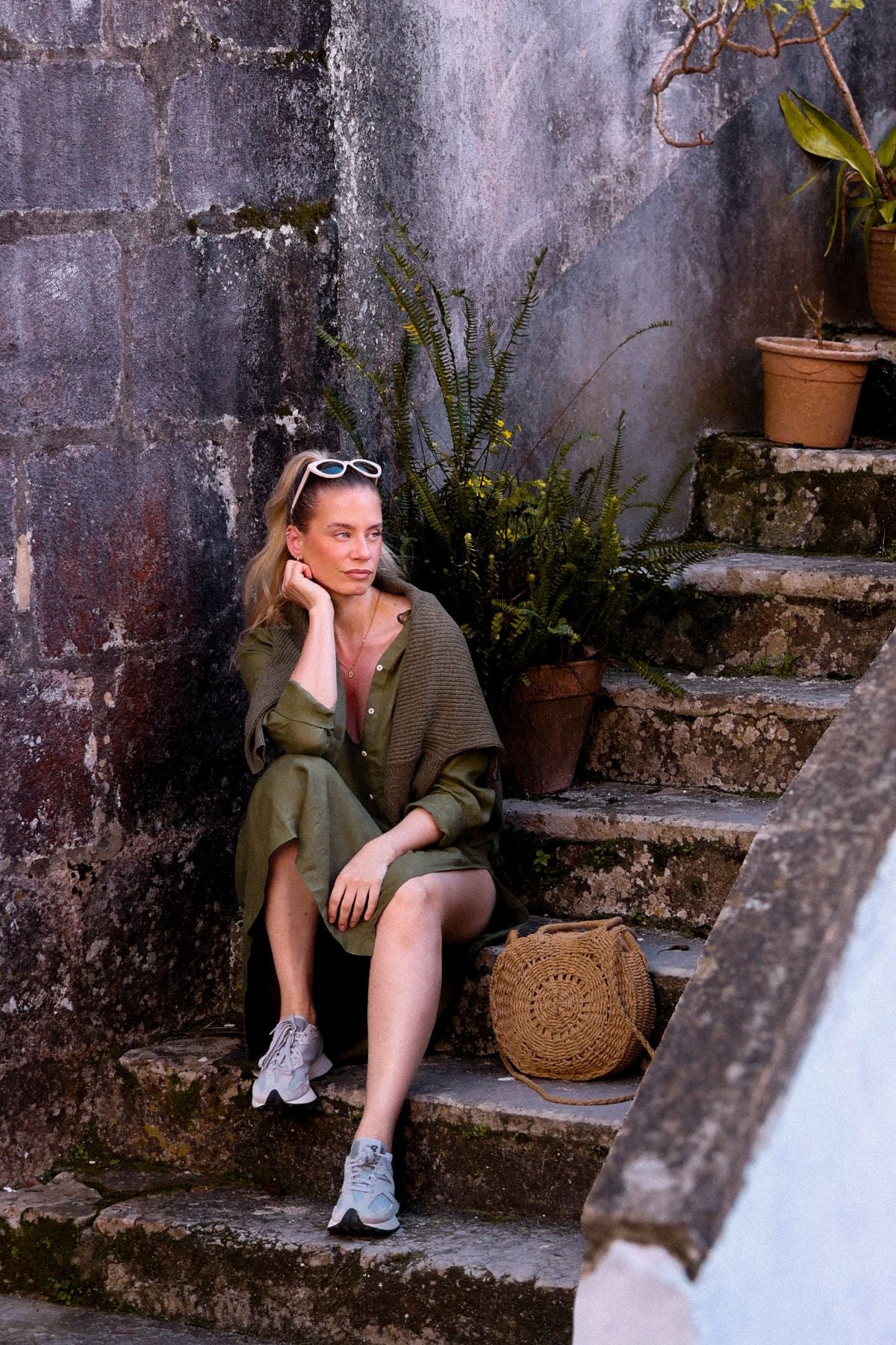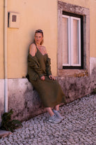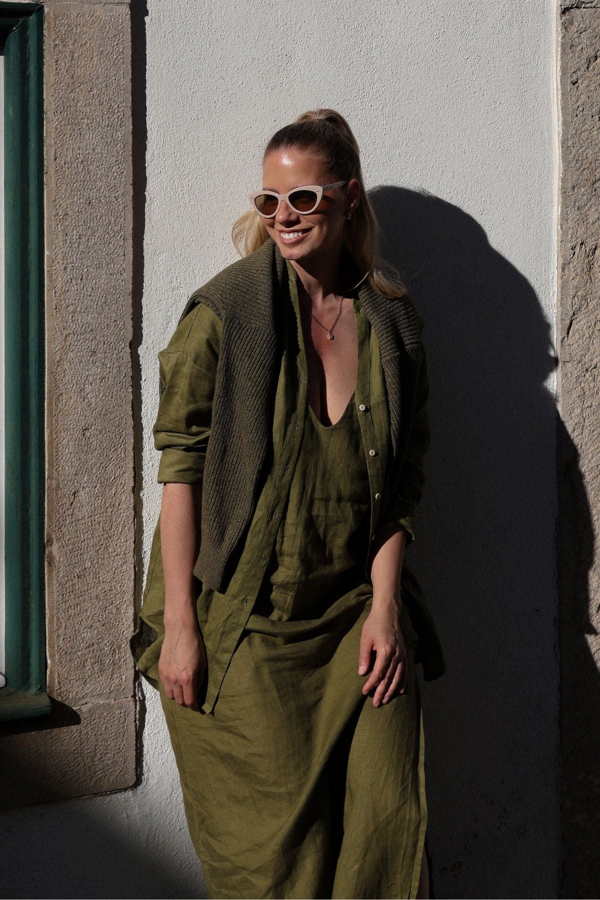 Outfit by Daniela All Moss green Linen dress & shirt